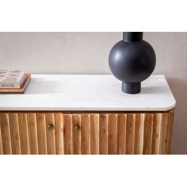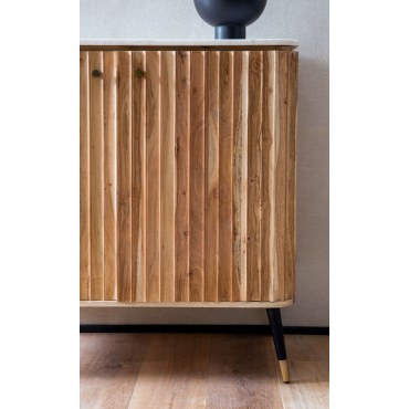 Nowoczesny barek do domu wykonany z litego drewna akacjowego i wykończony prawdziwym indyjskim marmurem. Stylowa forma z ryflowanym frontem, złoto-czarnymi detalami i funkcjonalnym wnętrzem sprawia, że ten mebel staje się centralnym punktem każdej aranżacji.