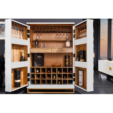 Barek GOLDEN SUNSET łączy elegancję nowoczesnego glamour z ciepłem naturalnego drewna mango. Rzeźbiony front 3D nadaje meblowi charakteru, a przemyślane wnętrze pozwala wygodnie przechowywać butelki, kieliszki i akcesoria barowe. Idealny do salonu, jadalni lub gabinetu – pełni funkcję praktyczną i dekoracyjną.