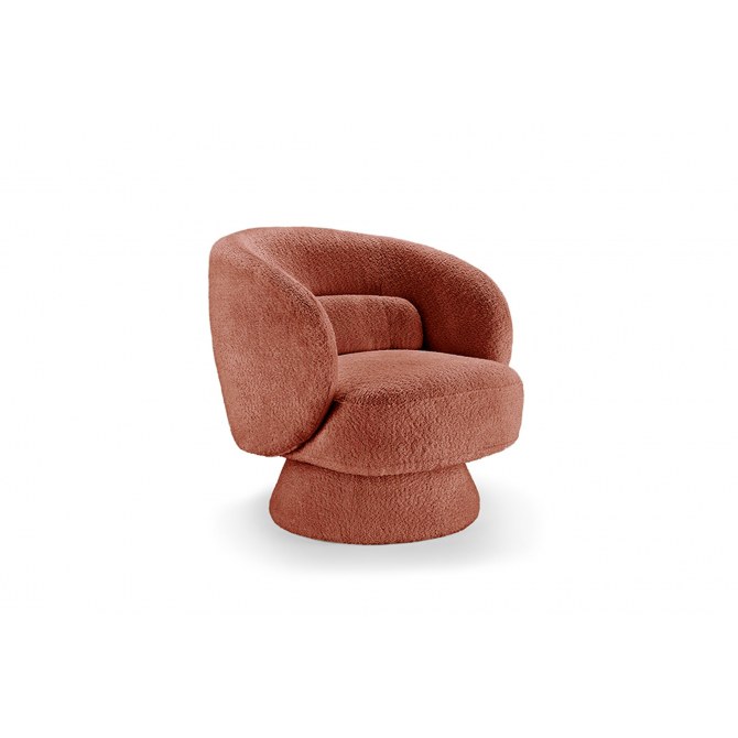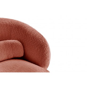 Elegancki fotel obrotowy „Bossa Nova” z miękką tkaniną bouclé (100% poliester) w kolorze odcieniu czerwieni. Model łączy styl retro z nowoczesną wygodą — idealny jako designerski element salonu, gabinetu lub wnętrza hotelowego.