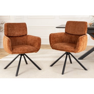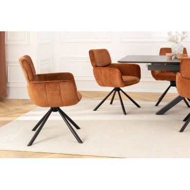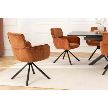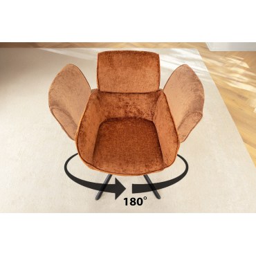 Łączące styl i wygodę — krzesło obrotowe UNIQUE 180° tapicerowane miękkim materiałem typu chenille w modnym, ciepłym odcieniu rdzawego brązu. Osadzone na czarnych, malowanych proszkowo nogach, obrotowe o 180°, sprawdzi się idealnie w salonie, biurze lub gabinecie.