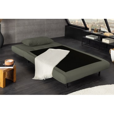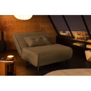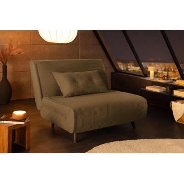 Wielofunkcyjny fotel typu „sleeping chair”, który w kilka sekund zmienia się z wygodnego siedziska w leżankę lub dodatkowe łóżko. Szerokość 100 cm zapewnia komfort dla jednej osoby, a miękka, prążkowana tkanina sztruksowa (cord) w modnym, zielonym kolorze doda wnętrzu przytulności — idealny do salonu, pokoju młodzieżowego lub gościnnego.