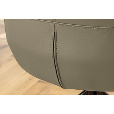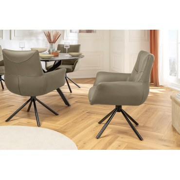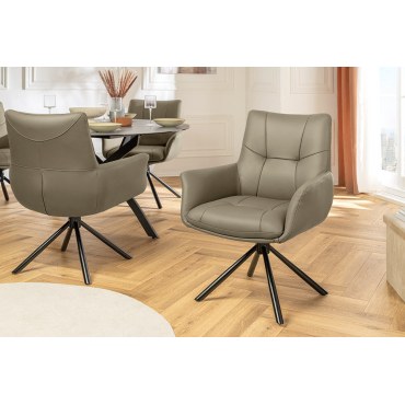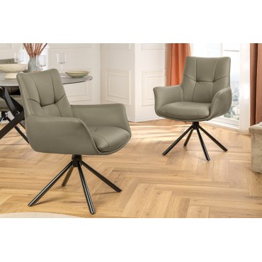 Elegancki fotel obrotowy do jadalni lub salonu. Miękka, naturalna skóra w kolorze taupe i stabilna, metalowa podstawa gwarantują komfort i trwałość. Mechanizm 360° ułatwia codzienne użytkowanie.