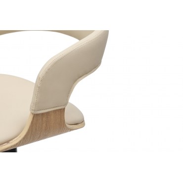 Hoker MANHATTAN to eleganckie połączenie wygody i ponadczasowego wzornictwa. Profilowane kubełkowe siedzisko wykończone skórą ekologiczną w kolorze kremowego beżu zestawiono z tyłem w drewnie dębowym (look). Regulacja wysokości i obrót 360° zapewniają pełen komfort przy wyspie kuchennej, barze lub wysokim blacie.
