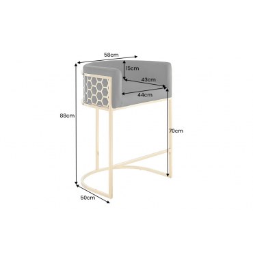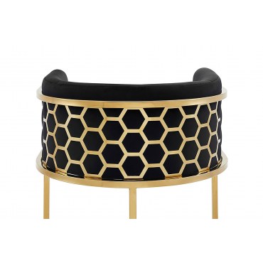 Elegancki hoker barowy łączący nowoczesny design i wysoki komfort. Miękkie siedzisko z czarnego weluru, delikatnie profilowane oparcie, podłokietniki oraz stabilna złota rama ze stali nierdzewnej sprawiają, że świetnie pasuje do wyspy kuchennej i domowego barku.