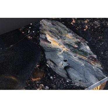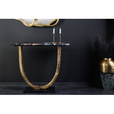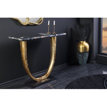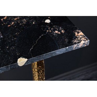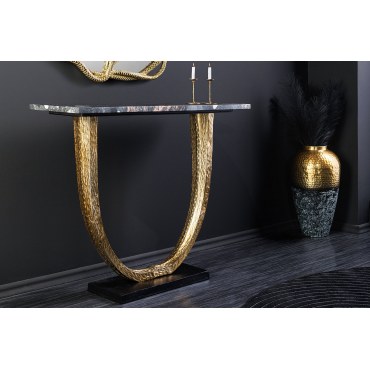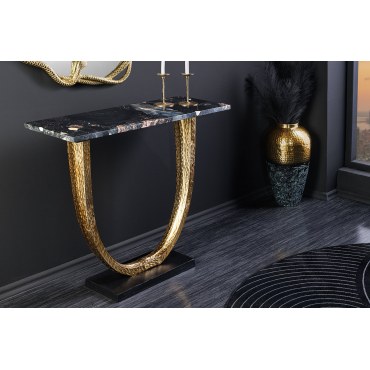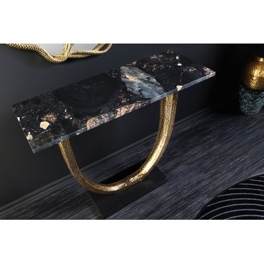 Stylowa konsola OMEGA to połączenie nowoczesnej formy i eleganckiego wykończenia. Solidna, geometryczna podstawa w kolorze złotym doskonale komponuje się z blatem imitującym czarny marmur, tworząc luksusowy mebel do holu, salonu lub sypialni. Dzięki kompaktowym wymiarom sprawdzi się nawet w niewielkich przestrzeniach.
