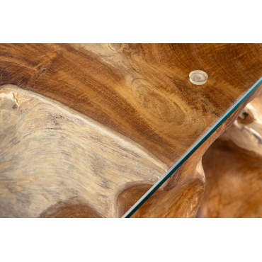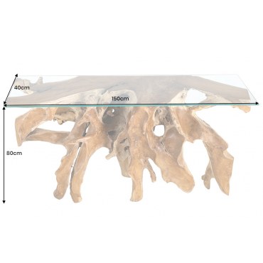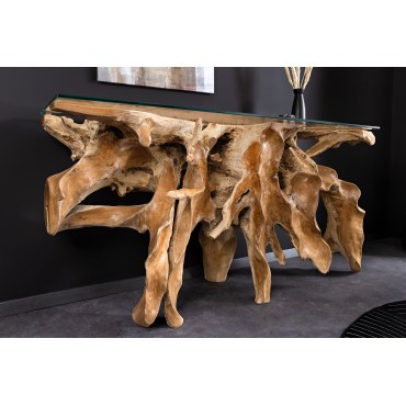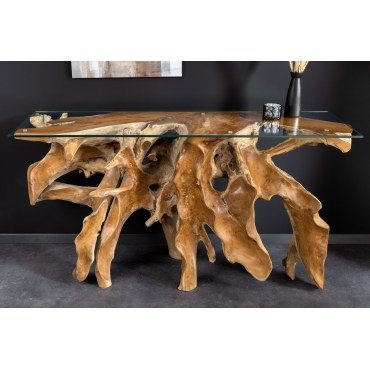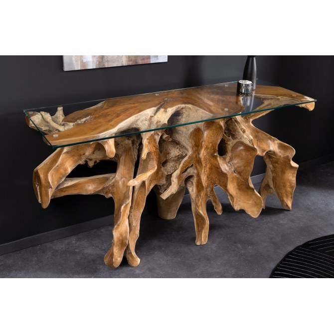 Efektowna, ręcznie wykonana konsola ze szklanym blatem z naturalnego drewna teak, o surowym, organicznym charakterze. Podkreślające piękno materiału i unikalny kształt korzenia.