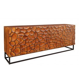 Komoda Sideboard VULCANO to mebel, który przyciąga uwagę swoim unikalnym designem i precyzyjnym wykonaniem. Front w formie trójwymiarowej mozaiki wykonanej z naturalnego drewna mango nadaje jej wyjątkowego charakteru, łącząc surową elegancję z artystycznym wyrazem.