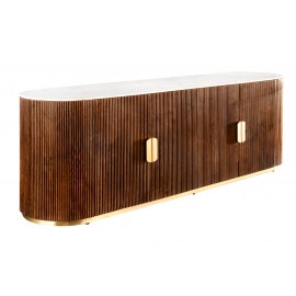 Biały marmurowy blat i ryflowana drewniana powierzchnia tworzą wygląd retro.