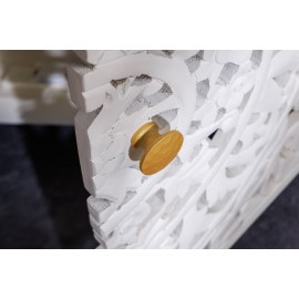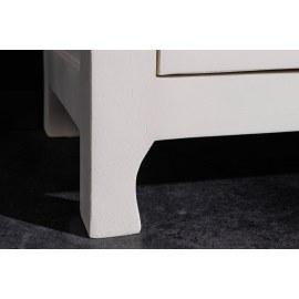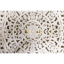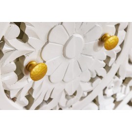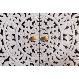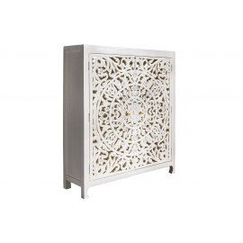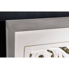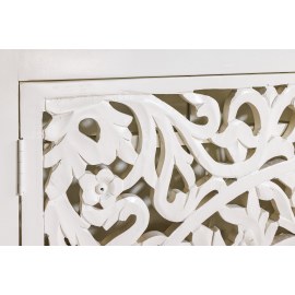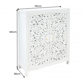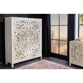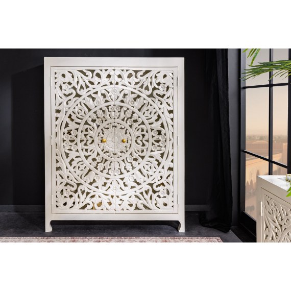 Komoda Highboard MARRAKESCH to wyjątkowy mebel, który zachwyca orientalnym designem i ręcznie wykonanymi zdobieniami. Wykonana z białego drewna mango, łączy w sobie funkcjonalność i dekoracyjny styl, doskonale wpasowując się w wnętrza w stylu boho, klasycznym lub skandynawskim.