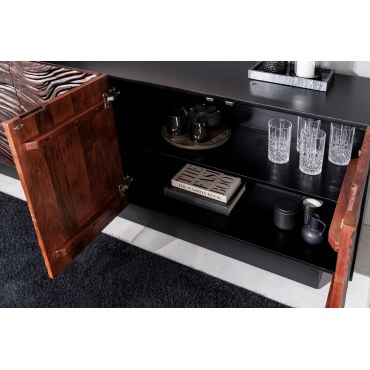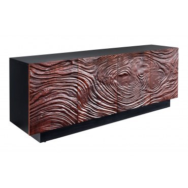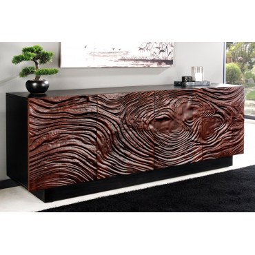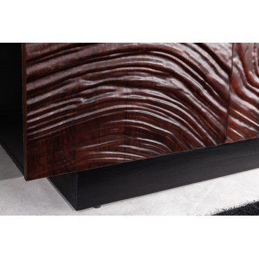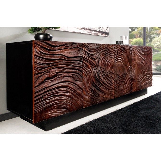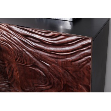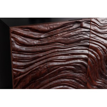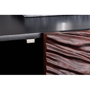 Komoda SIDEBOARD FLUID to elegancka komoda, która wprowadza do wnętrza luksusowy i nowoczesny styl. Dzięki wyjątkowej kombinacji czarnego akcentu z ciemnym orzechowym brązem oraz frontom o efektownym wzorze 3D, ten mebel zyskuje unikalny charakter, który doskonale komponuje się z różnymi stylami aranżacji. Wykonana z wysokiej jakości drewna akacjowego, komoda nie tylko zachwyca wyglądem, ale także oferuje przestronną przestrzeń do przechowywania.