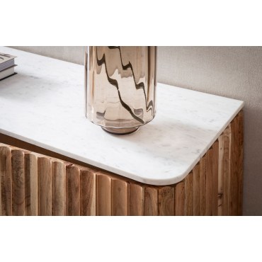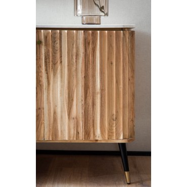 Dodaj swojemu wnętrzu odrobiny luksusu dzięki tej wyjątkowej komodzie w nowoczesnym stylu. Korpus z litego drewna akacjowego o delikatnie ryflowanej powierzchni w odcieniu jasnego złotego brązu doskonale komponuje się z eleganckim, białym blatem z prawdziwego indyjskiego marmuru. Czarne i złote metalowe nóżki dopełniają całości, tworząc designerski akcent.