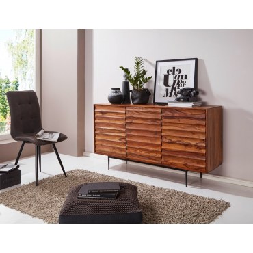 To imponujące, ręcznie wykonane sideboard w modnym stylu industrialnym zachwyca unikalnym designem. Wyraziste drewniane lamelki na frontach i solidne, czarne metalowe nogi tworzą harmonijną całość, która przyciąga wzrok w każdym wnętrzu – od salonu po korytarz.