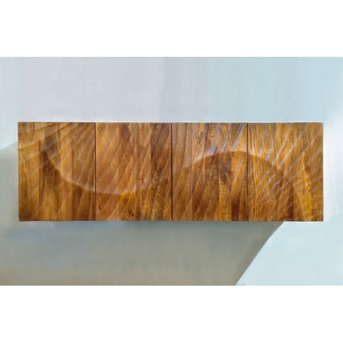 Komoda SCORPION to mebel, który łączy naturalny charakter z nowoczesnym wzornictwem. Wykonana z litego drewna mango w głębokim, ciepłym odcieniu brązu, przyciąga uwagę efektownym frontem o przestrzennej strukturze 3D, który tworzy dynamiczną, rzeźbiarską powierzchnię.