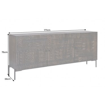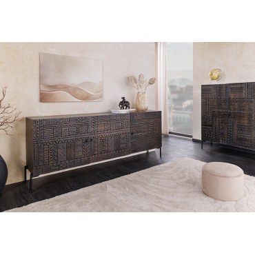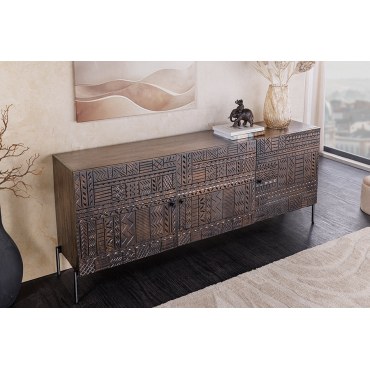 Komoda TRIBAL łączy w sobie funkcjonalność i niepowtarzalny design – za trzema bogato rzeźbionymi drzwiami kryje się dużo miejsca do przechowywania. Idealna do salonu, jadalni, holu lub sypialni. Jej solidna konstrukcja i styl vintage doskonale odnajdują się zarówno w nowoczesnych aranżacjach typu loft, jak i we wnętrzach boho czy kolonialnych.