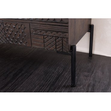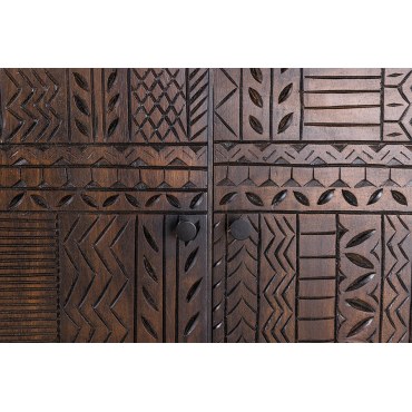 Wprowadź do swojego wnętrza nutę egzotyki i rękodzielniczego kunsztu dzięki wyjątkowej komodzie TRIBAL. Ten solidny mebel wykonano z naturalnego, wysokiej jakości drewna mango w głębokim, ciemnobrązowym odcieniu. Jego fronty ozdobiono unikalnymi, trójwymiarowymi wzorami inspirowanymi motywami plemiennymi, które nadają całości artystycznego charakteru i sprawiają, że każdy egzemplarz jest jedyny w swoim rodzaju.