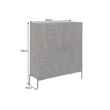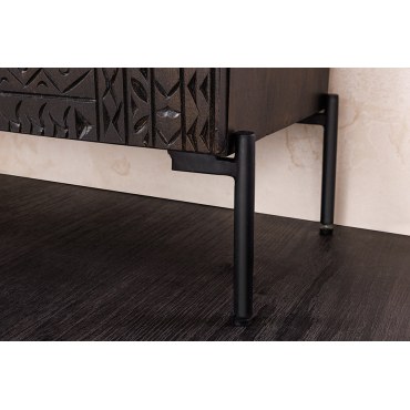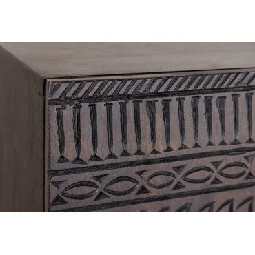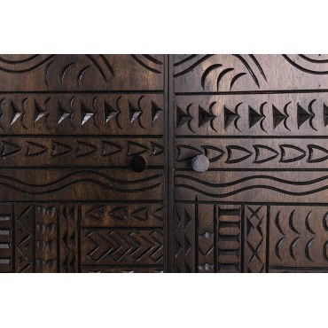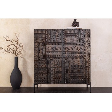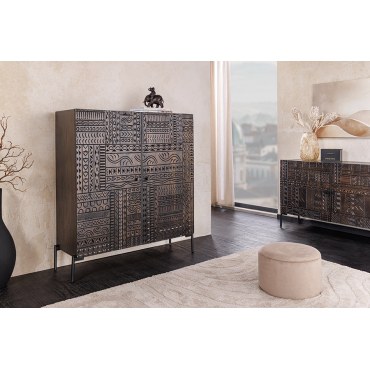 Oryginalny wysoki kredens TRIBAL to propozycja dla miłośników niebanalnych, ręcznie wykonanych mebli z charakterem. Mebel wykonano z litego drewna mango w ciepłym, ciemnym wybarwieniu. Fronty ozdobione zostały trójwymiarowym wzorem inspirowanym sztuką plemienną, co czyni każdą sztukę niepowtarzalnym dziełem rzemiosła.