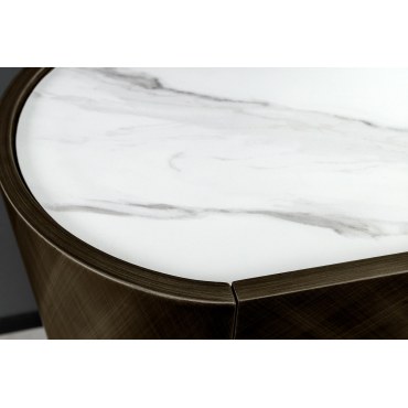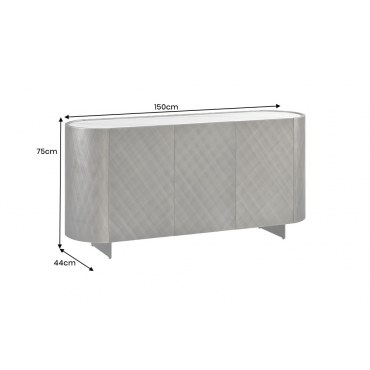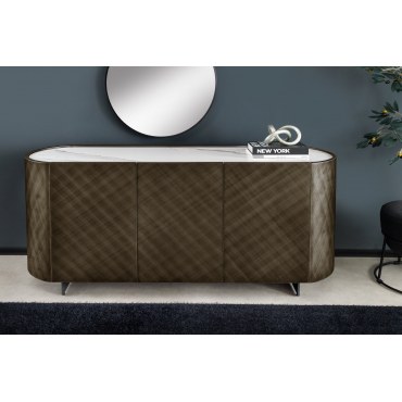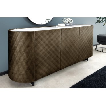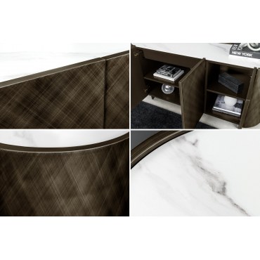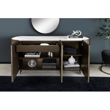 Elegancka komoda REFLECTION z dekoracyjnym frontem o trójwymiarowej (3D) strukturze w kolorze bronze. Całość osadzona na czarnym stelażu, zwieńczona białym blatem ceramicznym o efekcie marmuru. Funkcjonalne wnętrze (półki i szuflada) zapewnia dużo miejsca do przechowywania w salonie, jadalni lub gabinecie.