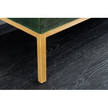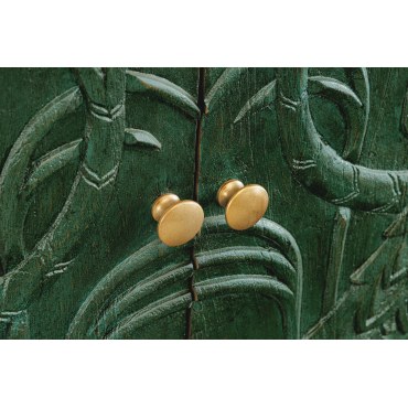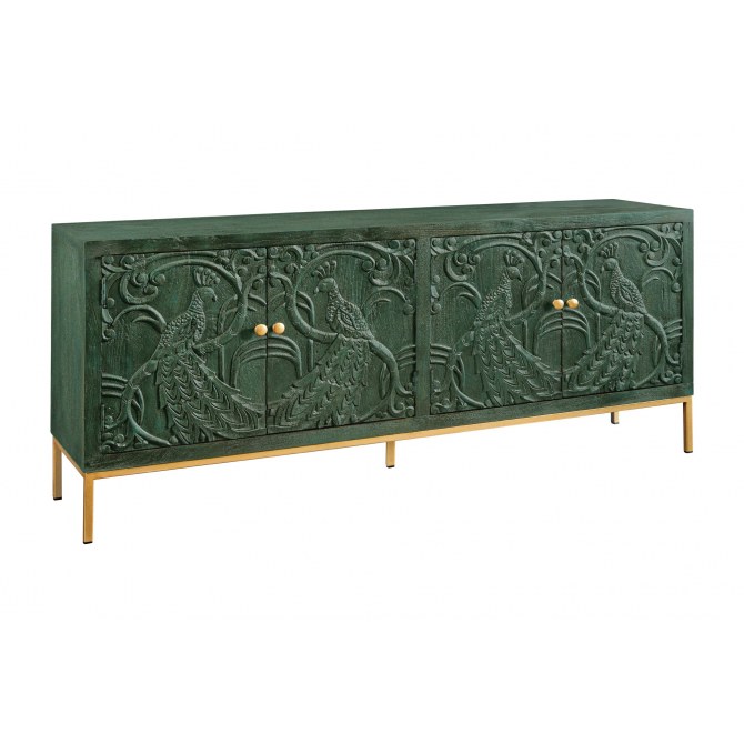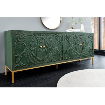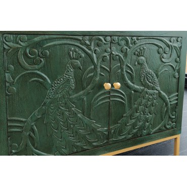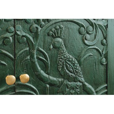 Efektowna komoda z rzeźbionym frontem 3D inspirowanym piórami pawia. Wykonana z litego drewna mango, wykończona w głębokiej, antycznej zieleni z delikatną patyną. Złote detale podkreślają charakter „statement piece”. Idealna do salonu lub jadalni.