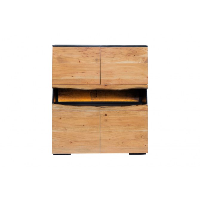 Stylowy i funkcjonalny highboard Grand Acacia wykonany z litego drewna akacjowego z naturalną, nieregularną krawędzią, która podkreśla charakter materiału i nadaje meblowi unikatowy wygląd. Czarny metalowy stelaż oraz wbudowane oświetlenie LED dodają mu nowoczesnego stylu. Komoda oferuje dużą przestrzeń do przechowywania i świetnie sprawdzi się w salonie, jadalni, przedpokoju lub sypialni.