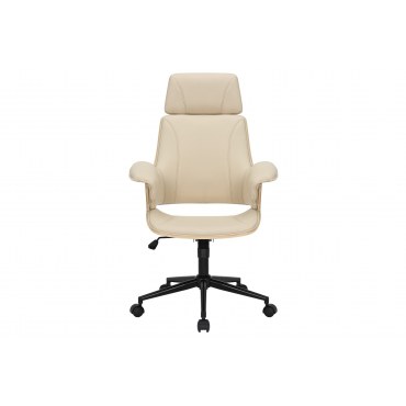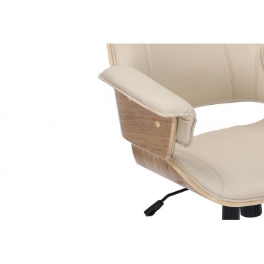 Fotel MANHATTAN łączy elegancję z wygodą pracy. Kubełkowe siedzisko wykończone skórą ekologiczną (PU) w kolorze kremowego beżu oraz oparcie z forniru dębowego tworzą stylową całość do biura, gabinetu i home office. Regulacja wysokości 44–54 cm, obrót 360° i kółka zapewniają mobilność i komfort przez cały dzień.