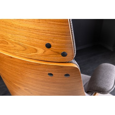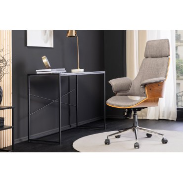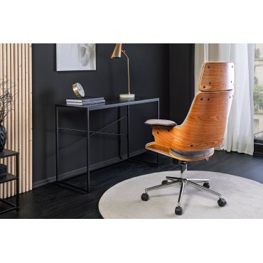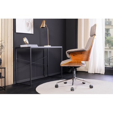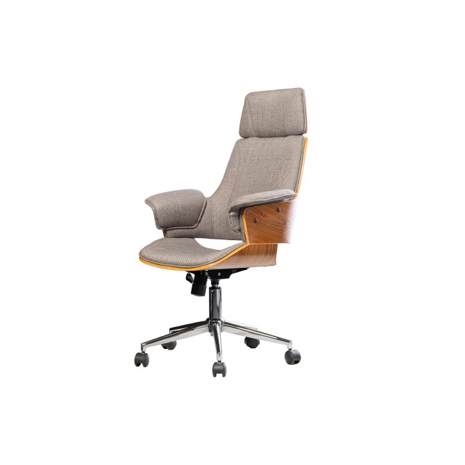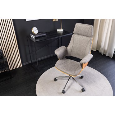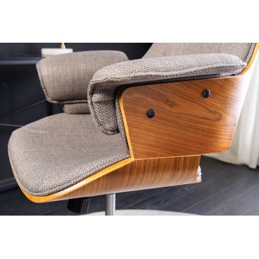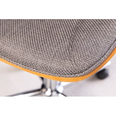 Fotel MANHATTAN łączy elegancję z wygodą pracy. Kubełkowe siedzisko z tkaniny strukturalnej (plecionej) w kolorze szarym oraz oparcie wykończone drewnem/orzechem (fornir) tworzą stylową całość do biura, gabinetu i domowego stanowiska pracy. Regulacja wysokości 44–54 cm, obrót 360° oraz kółka zapewniają pełną mobilność i komfort przez cały dzień.