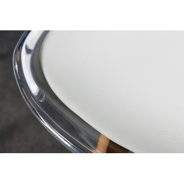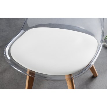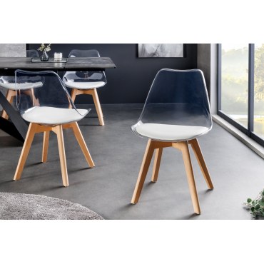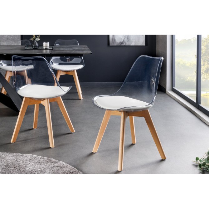Stylowe i funkcjonalne krzesło z przejrzystym białym siedziskiem i nogami z bukowego drewna – świetnie sprawdzi się w nowoczesnych aranżacjach jadalni, kuchni, salonu czy wnętrza biurowego. Wyjątkowo wygodne i eleganckie.