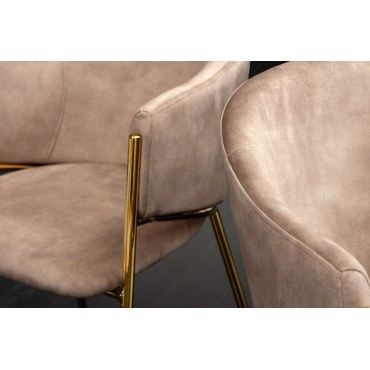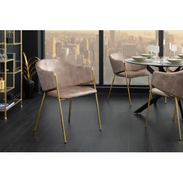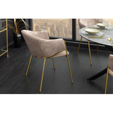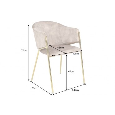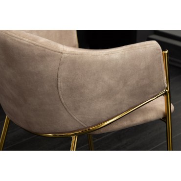 Eleganckie krzesło tapicerowane miękką tkaniną velvet w kolorze champagne beige. Smukłe złote nogi dodają wnętrzu luksusowego charakteru, a kubełkowa forma zapewnia wygodę podczas posiłków i dłuższych spotkań. Idealne do jadalni, salonu, gabinetu czy stylowej kawiarni.