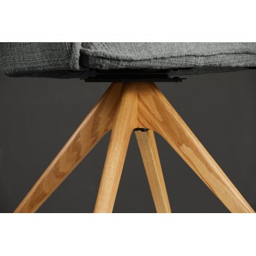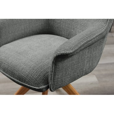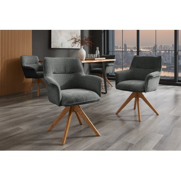 LE GRAND łączy przytulny wygląd z funkcjonalnością. Szary, miękki materiał chenille ociepla wnętrze, a dębowe nogi wprowadzają naturalny charakter. Mechanizm obrotu 180° ułatwia codzienne użytkowanie przy stole, minimalizując konieczność odsuwania krzesła. Ergonomiczne oparcie i podłokietniki zapewniają komfort podczas posiłków i spotkań.