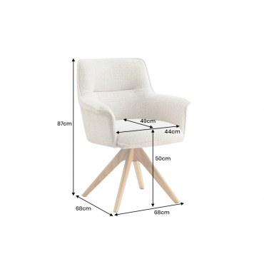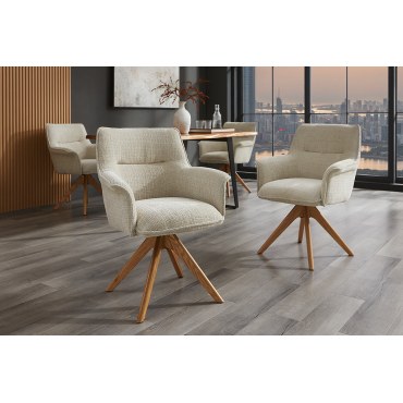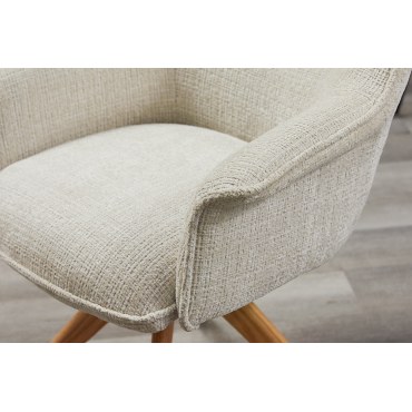 LE GRAND łączy przytulny wygląd z funkcjonalnością. Beżowa, miękka tkanina chenille ociepla wnętrze, a dębowe nogi wprowadzają naturalny akcent. Mechanizm obrotu 180° ułatwia codzienne użytkowanie przy stole, ograniczając konieczność odsuwania krzesła. Ergonomiczne oparcie i podłokietniki dbają o wygodę podczas posiłków i spotkań towarzyskich.