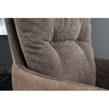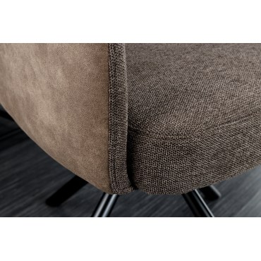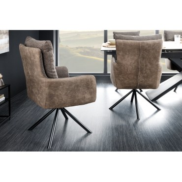 Elegancki fotel do jadalni lub salonu z wygodnymi podłokietnikami. Łączy miękką w dotyku mikrofibrę na siedzisku z odporną tkaniną płócienną (flat-woven) na oparciu. Stabilna, obrotowa podstawa ułatwia wstawanie i zapewnia komfort przy stole.