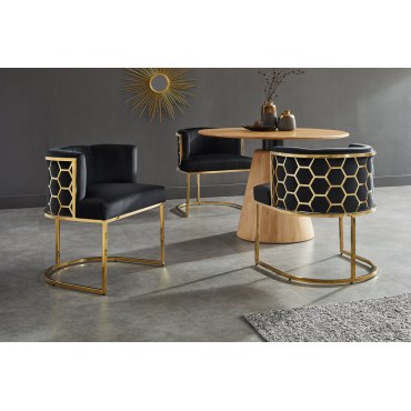 Wnieś do swojego wnętrza luksus i elegancję dzięki krzesłu ELEGANCE. Połączenie aksamitnej tkaniny w głębokiej czerni oraz złotej, metalowej konstrukcji nadaje meblowi wyjątkowy charakter i sprawia, że staje się on centralnym elementem każdej przestrzeni.