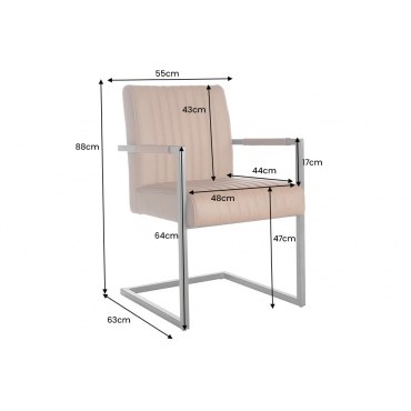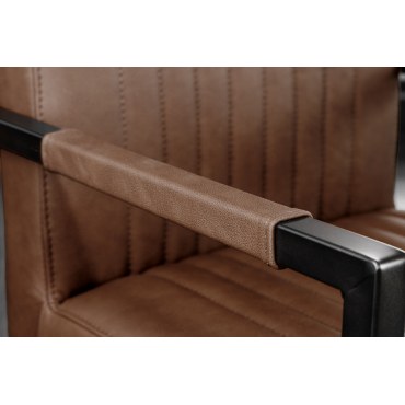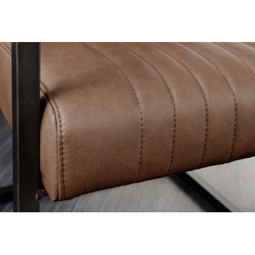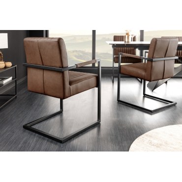 Postarzana optyka skóry nadaje meblowi charakteru, a delikatnie uginająca się konstrukcja typu freischwinger zapewnia wysoki komfort siedzenia. Wysokie oparcie, wygodne podłokietniki oraz sprężyste siedzisko sprawiają, że nawet dłuższe siedzenie przy stole jest przyjemne.