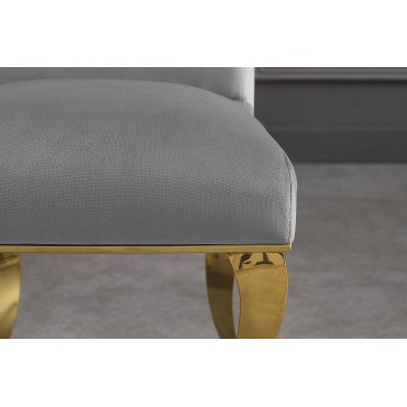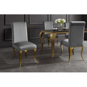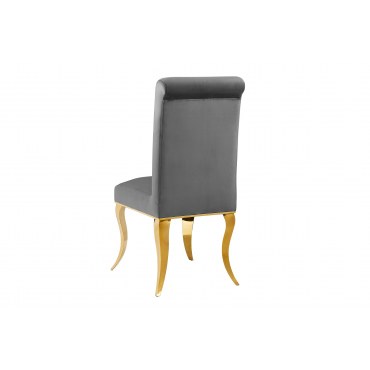 Eleganckie krzesło w stylu modern barock, które łączy luksusowy wygląd z nowoczesnym designem. Miękka, szara tapicerka welurowa pięknie kontrastuje ze złotą, błyszczącą podstawą ze stali nierdzewnej. To idealny model do jadalni, salonu, restauracji, sali bankietowej czy eleganckiego biura – wszędzie tam, gdzie liczy się efekt „wow”.