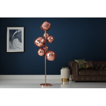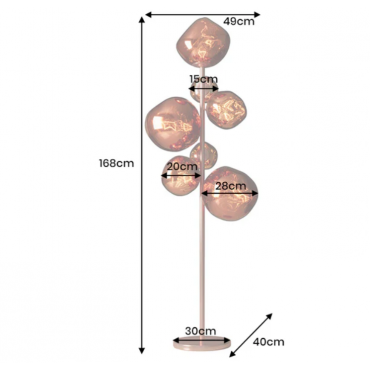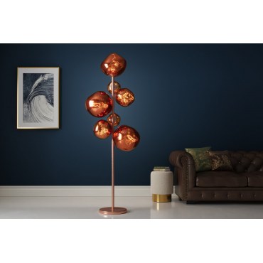 Lampa Podłogowa LIQUID DIAMOND 170 cm – 7 Szklanych Kloszy Bursztynowych, Miedziana Rama