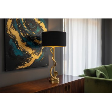 Imponująca lampa stołowa Cobra 110 cm łączy elegancję i nowoczesność. Duży, czarny abażur zestawiony ze złotą metalową konstrukcją tworzy efektowny element dekoracyjny do salonu, sypialni, biura lub przestrzeni wypoczynkowej. Lampa nie tylko doskonale oświetla wnętrze, ale także przyciąga wzrok jako designerski dodatek o wyrafinowanym stylu.