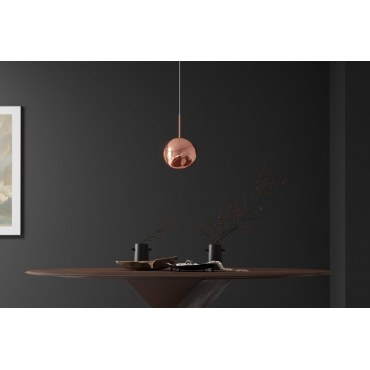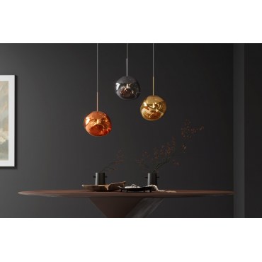 Ta stylowa lampa wisząca zachwyca eleganckim kloszem w kształcie kropli z bursztynowego szkła, który pięknie rozprasza światło i nadaje wnętrzu przytulny, ciepły charakter. Detale w złotym wykończeniu podkreślają nowoczesny design lampy, czyniąc ją idealnym dodatkiem do salonu, jadalni, sypialni lub korytarza.