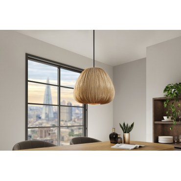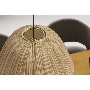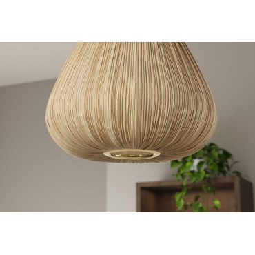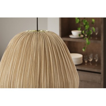 Elegancka lampa wisząca Organic o średnicy 30 cm łączy naturalne materiały z subtelnym luksusem. Jej klosz z tkaniny w odcieniu złota emituje ciepłe, przytulne światło, idealnie komponując się w stylowych wnętrzach inspirowanych naturą.