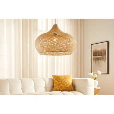 Lekka i efektowna lampa sufitowa z plecionym kloszem z naturalnego bambusa. Średnica 60 cm tworzy piękną, dekoracyjną poświatę i rysuje na ścianach subtelne cienie. Idealna do salonu, jadalni, sypialni oraz wnętrz w stylu boho, japandi i skandynawskim.