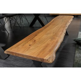 Wykonany z litego drewna akacjowego o grubości panelu 35 mm z naturalną krawędzią drzewa i metalową ramą X o industrialnym wyglądzie.