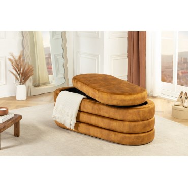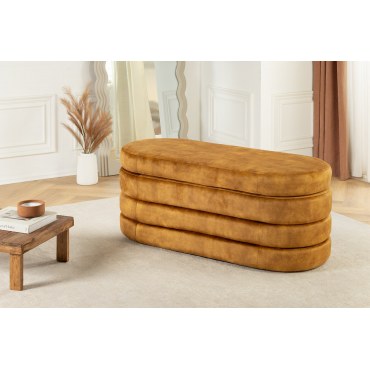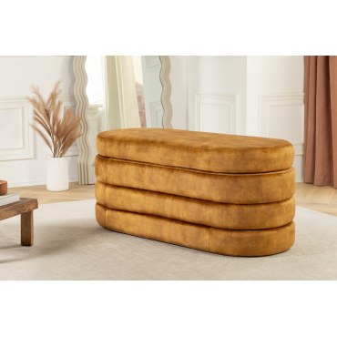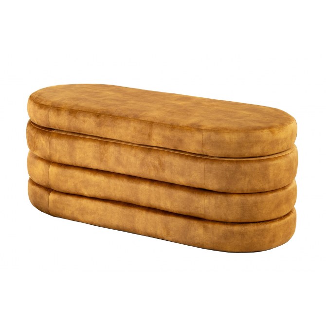Nowoczesny i praktyczny design z odrobiną stylu retro – ławka VOQUE o szerokości 115 cm, tapicerowana miękkim welurem w modnym, ciepłym odcieniu musztardowym. Ukryty schowek pod siedziskiem zapewnia dodatkową przestrzeń do przechowywania, idealną do przedpokoju, domu czy sypialni.