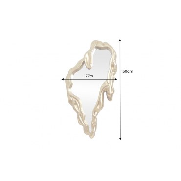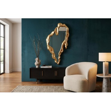 Lustro ścienne FLUIDUM to wyjątkowy element dekoracyjny, który łączy w sobie funkcjonalność z efektownym designem. Złota rama o organicznych, dynamicznych kształtach przyciąga uwagę i staje się wyrazistym akcentem w aranżacji wnętrza. Duża powierzchnia lustra optycznie powiększa przestrzeń oraz poprawia jej doświetlenie, a pionowy montaż pozwala wykorzystać je jako lustro do pełnej sylwetki. Produkt przeznaczony jest do użytku wewnętrznego i nie nadaje się do pomieszczeń o podwyższonej wilgotności.