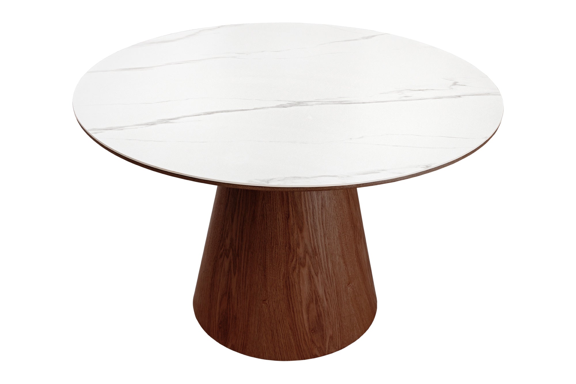 Elegancki, okrągły stół jadalniany marki Invicta Interior, który łączy ciepły dekor fornirowanego drewna orzechowego z wyrafinowanym, białym blatem ceramicznym o marmurowym wyglądzie. Kompaktowy rozmiar o średnicy 120 cm sprawia, że mebel doskonale pasuje do mniejszych jadalni, kuchni lub przestrzeni śniadaniowych, tworząc przy tym punkt centralny przy wspólnych posiłkach.
