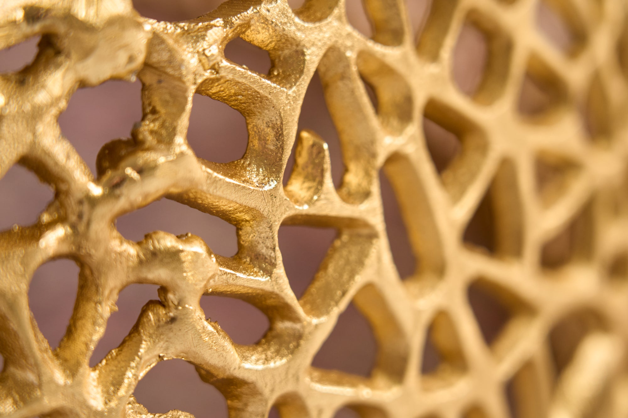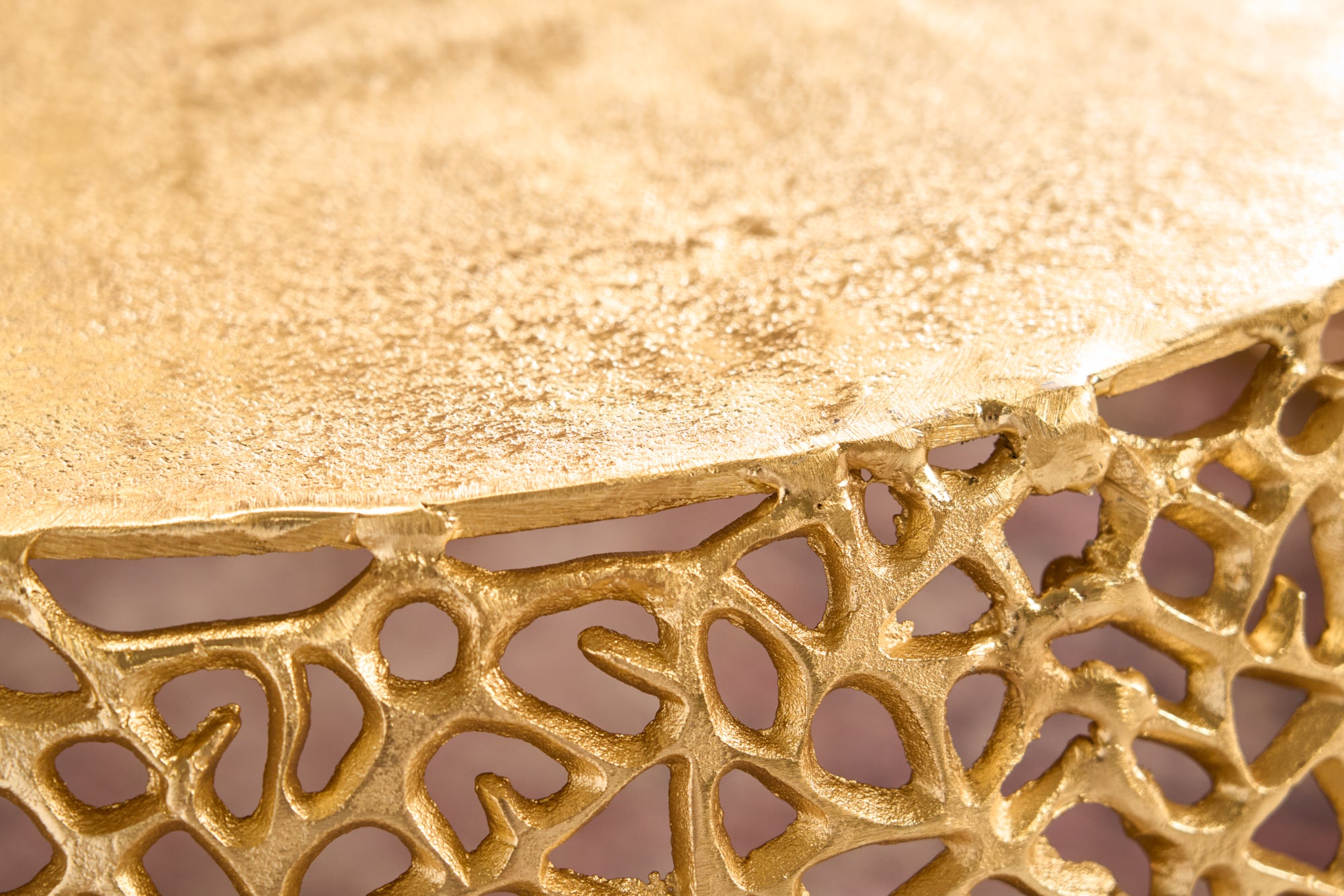 Dekoracyjny stolik kawowy marki Invicta Interior inspirowany kształtem liścia. Złote wykończenie oraz rzeźbiarska forma nadają meblowi elegancki i wyrazisty charakter, dzięki czemu pełni zarówno funkcję użytkową, jak i ozdobną.