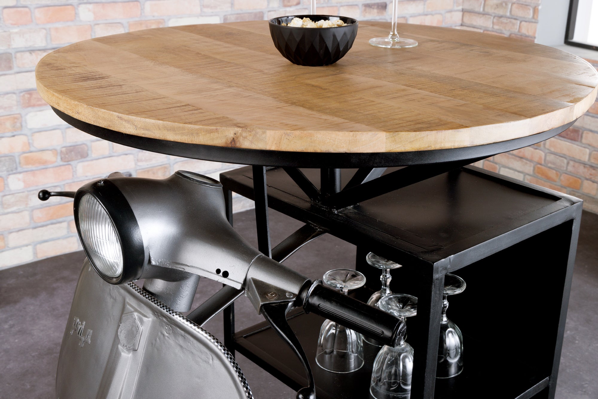 Oryginalny barek marki Invicta Interior wykonany z lakierowanej stali z frontem stylizowanym na klasyczny skuter oraz blatem z litego drewna mango. Połączenie motoryzacyjnej stylistyki z naturalnym drewnem tworzy wyrazisty mebel o industrialno-vintage charakterze.