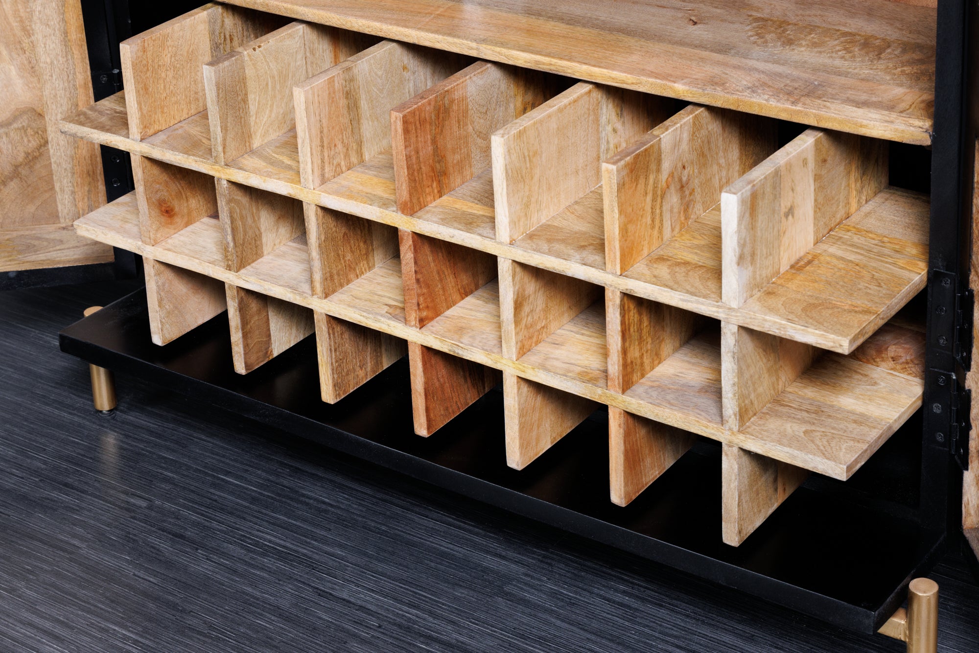 Najbardziej charakterystycznym elementem mebla są fronty z ręcznie wykonanym wzorem mandali w formie rzeźby 3D. Tworzą one efekt światłocienia i sprawiają, że barek staje się centralnym punktem aranżacji. Połączenie czerni z złotymi akcentami nadaje mu luksusowy, a jednocześnie loftowy charakter.