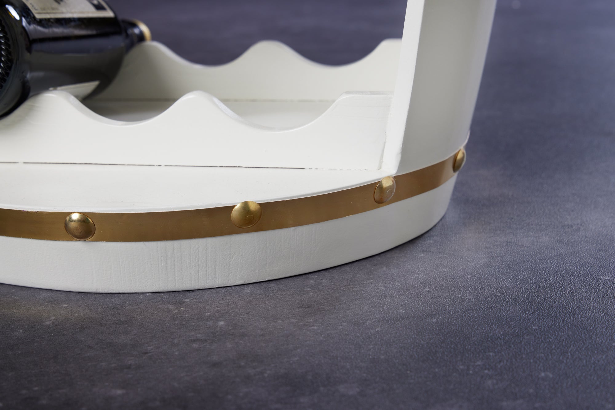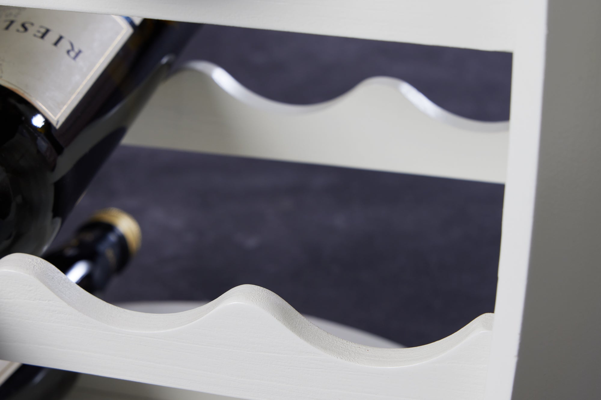 Biała kolorystyka w połączeniu z metalowymi detalami sprawia, że mebel świetnie wpisuje się zarówno w styl rustykalny, jak i nowoczesny czy prowansalski. To nie tylko praktyczny stojak na wino, ale również efektowny element dekoracyjny wnętrza.