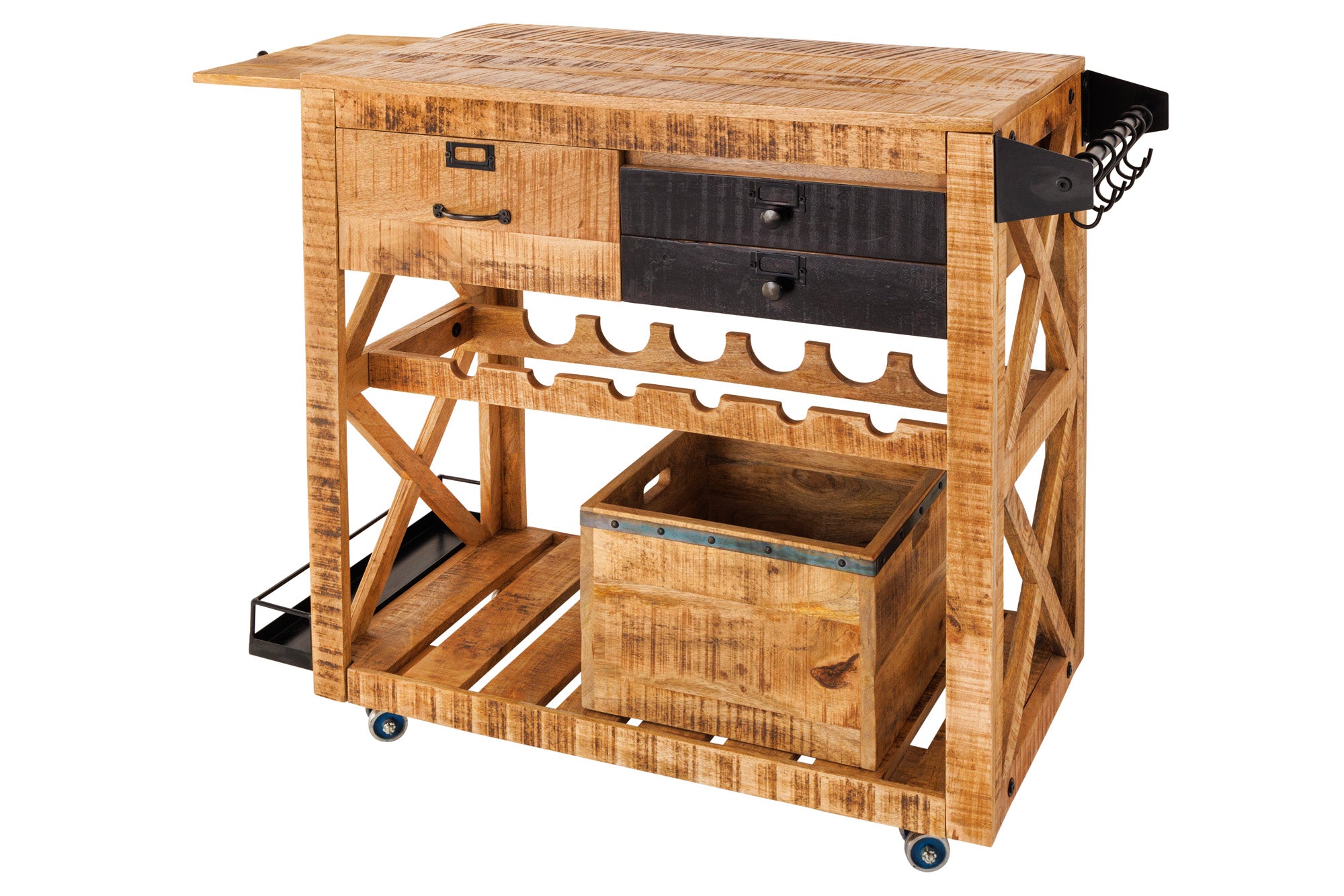 Nowoczesny barek o industrialnym charakterze, wykonany z litego drewna mango i metalowych elementów. Model BODEGA to bardzo funkcjonalny mebel, który łączy styl loftowy z praktycznym zastosowaniem – idealny do salonu, jadalni lub domowego barku.