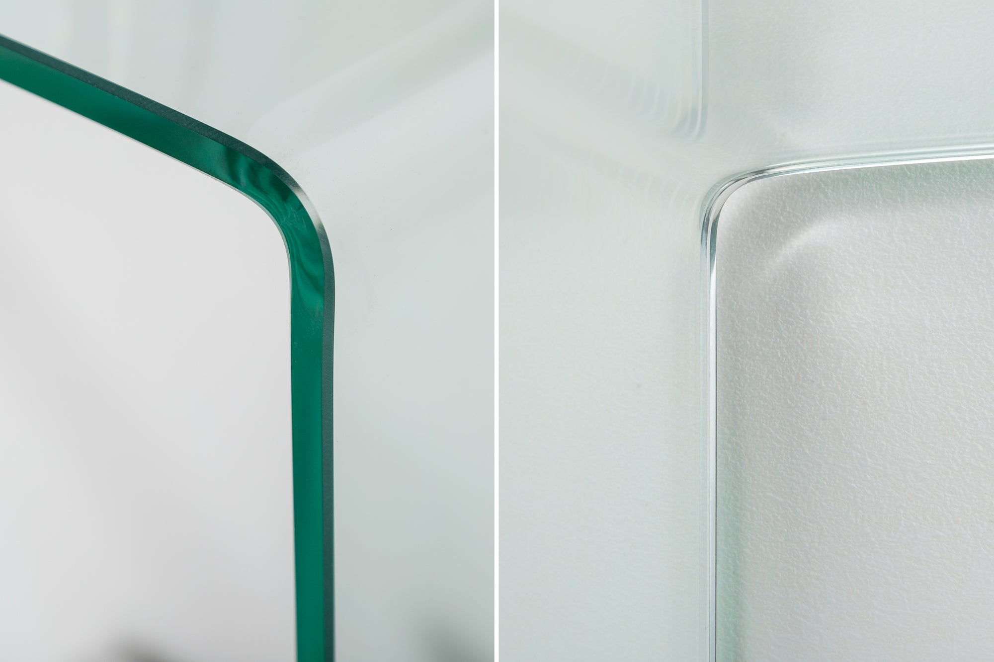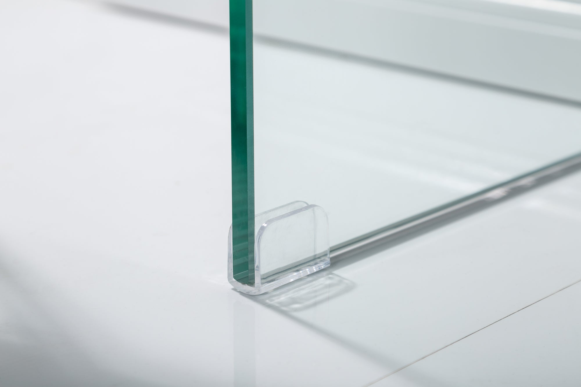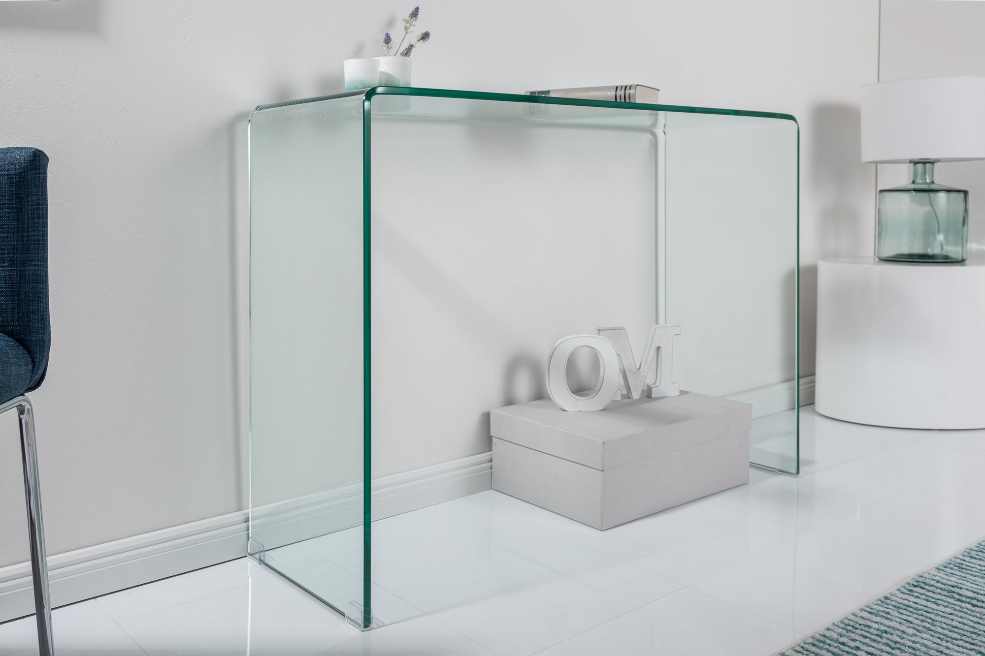 Biurko zostało wykonane z jednego, giętego elementu szkła, co eliminuje widoczne łączenia i podkreśla jego designerski charakter. Prosta, geometryczna forma sprawia, że mebel doskonale sprawdzi się zarówno jako biurko do pracy, jak i stylowa konsola lub stolik pod laptopa.