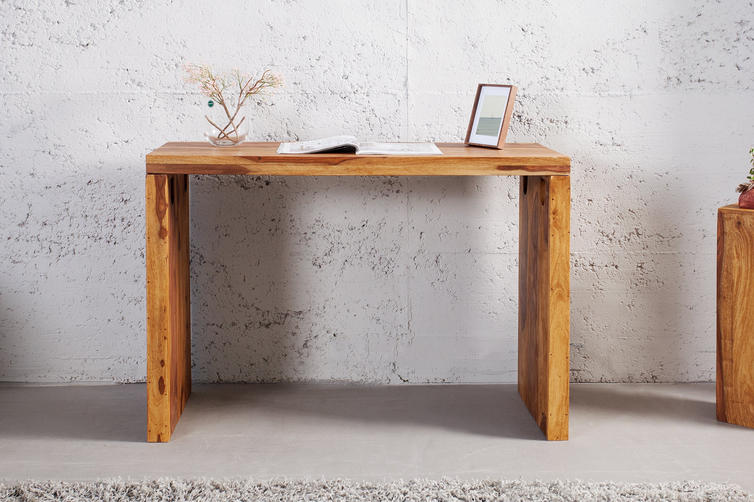 Eleganckie biurko o prostej, ponadczasowej formie, wykonane w całości z litego drewna sheesham. Naturalne usłojenie oraz ciepła kolorystyka nadają meblowi wyjątkowy charakter, dzięki czemu każdy egzemplarz jest niepowtarzalny.