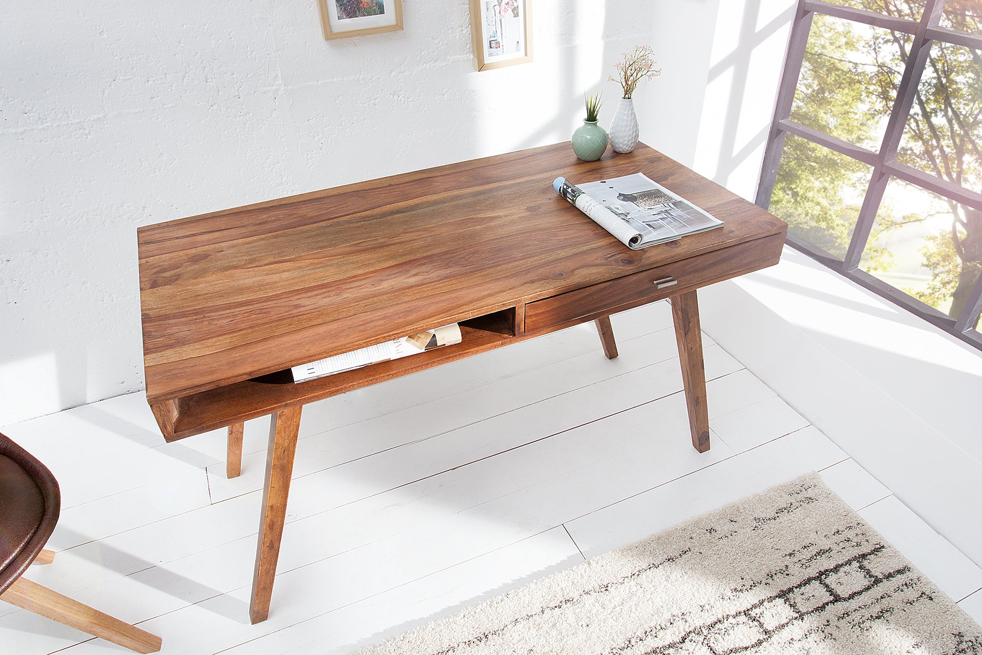 Stylowe biurko w klimacie retro, wykonane z litego drewna sheesham (palisander indyjski), które łączy naturalne piękno z funkcjonalnością. Prosta forma inspirowana designem lat 60. i 70. sprawia, że mebel doskonale pasuje zarówno do wnętrz klasycznych, jak i nowoczesnych.